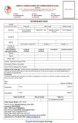 Eligibility for life membership: Medical practitioners with qualification registered with MCI or those possessing Masters degree in science with >5yrs of work in the field of leprosy or those with PhD in science with >3 years of work in leprosy. One-time life Membership fee is Rs. 5,000 (Rs. Five thousand only).